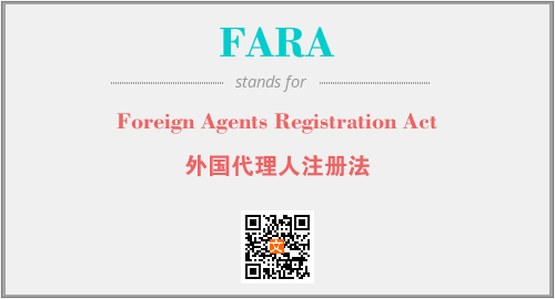 英文缩略词“FARA”经常作为“Foreign Agents Registration Act”的英文缩写来使用,中文表示:“外国代理人注册法”。本文将详细介绍英文缩写词FARA所代表英文单词,其对应的中文拼音、详细解释以及在英语中的流行度。此外,还有关于缩略词FARA的分类、应用领域及相关应用示例等。
