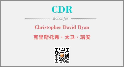 上述内容是“Christopher David Ryan”作为“CDR”的缩写,解释为“克里斯托弗·大卫·瑞安”时的信息,以及英文缩略词CDR所代表的英文单词,其对应的中文拼音、详细解释以及在英文中的流行度和相关分类、应用领域及应用示例等。