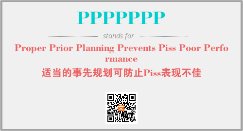 以上为Proper Prior Planning Prevents Piss Poor Performance英文缩略词PPPPPPP的中文解释,以及该英文缩写在英语的流行度、分类和应用领域方面的信息。
