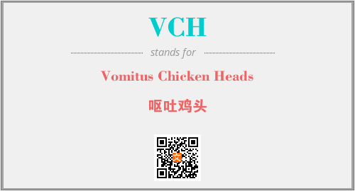 上述内容是“Vomitus Chicken Heads”作为“VCH”的缩写,解释为“呕吐鸡头”时的信息,以及英文缩略词VCH所代表的英文单词,其对应的中文拼音、详细解释以及在英文中的流行度和相关分类、应用领域及应用示例等。