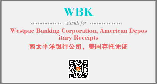 上述内容是“Westpac Banking Corporation, American Depositary Receipts”作为“WBK”的缩写,解释为“西太平洋银行公司,美国存托凭证”时的信息,以及英文缩略词WBK所代表的英文单词,其对应的中文拼音、详细解释以及在英文中的流行度和相关分类、应用领域及应用示例等。