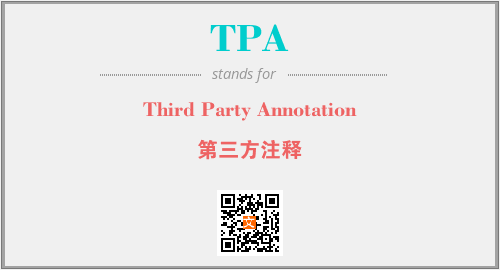 上述内容是“Third Party Annotation”作为“TPA”的缩写,解释为“第三方注释”时的信息,以及英文缩略词TPA所代表的英文单词,其对应的中文拼音、详细解释以及在英文中的流行度和相关分类、应用领域及应用示例等。