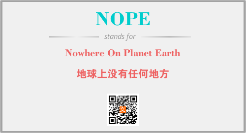 以上为Nowhere On Planet Earth英文缩略词NOPE的中文解释,以及该英文缩写在英语的流行度、分类和应用领域方面的信息。