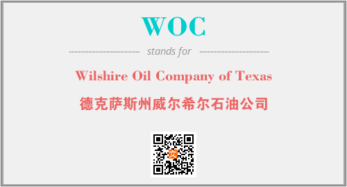 上述内容是“Wilshire Oil Company of Texas”作为“WOC”的缩写,解释为“德克萨斯州威尔希尔石油公司”时的信息,以及英文缩略词WOC所代表的英文单词,其对应的中文拼音、详细解释以及在英文中的流行度和相关分类、应用领域及应用示例等。
