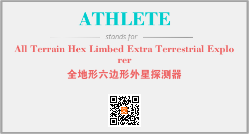英文缩略词“ATHLETE”经常作为“All Terrain Hex Limbed Extra Terrestrial Explorer”的英文缩写来使用,中文表示:“全地形六边形外星探测器”。本文将详细介绍英文缩写词ATHLETE所代表英文单词,其对应的中文拼音、详细解释以及在英语中的流行度。此外,还有关于缩略词ATHLETE的分类、应用领域及相关应用示例等。