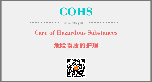 英文缩略词“COHS”经常作为“Care of Hazardous Substances”的英文缩写来使用,中文表示:“危险物质的护理”。本文将详细介绍英文缩写词COHS所代表英文单词,其对应的中文拼音、详细解释以及在英语中的流行度。此外,还有关于缩略词COHS的分类、应用领域及相关应用示例等。