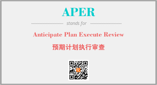 上述内容是“Anticipate Plan Execute Review”作为“APER”的缩写,解释为“预期计划执行审查”时的信息,以及英文缩略词APER所代表的英文单词,其对应的中文拼音、详细解释以及在英文中的流行度和相关分类、应用领域及应用示例等。