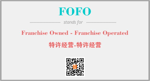 上述内容是“Franchise Owned - Franchise Operated”作为“FOFO”的缩写,解释为“特许经营-特许经营”时的信息,以及英文缩略词FOFO所代表的英文单词,其对应的中文拼音、详细解释以及在英文中的流行度和相关分类、应用领域及应用示例等。