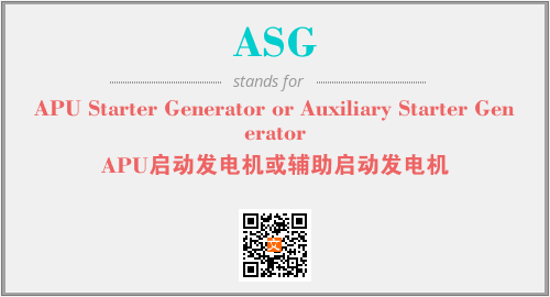 上述内容是“APU Starter Generator or Auxiliary Starter Generator”作为“ASG”的缩写,解释为“APU启动发电机或辅助启动发电机”时的信息,以及英文缩略词ASG所代表的英文单词,其对应的中文拼音、详细解释以及在英文中的流行度和相关分类、应用领域及应用示例等。