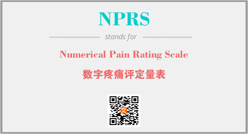 上述内容是“Numerical Pain Rating Scale”作为“NPRS”的缩写,解释为“数字疼痛评定量表”时的信息,以及英文缩略词NPRS所代表的英文单词,其对应的中文拼音、详细解释以及在英文中的流行度和相关分类、应用领域及应用示例等。