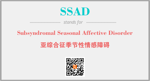 上述内容是“Subsyndromal Seasonal Affective Disorder”作为“SSAD”的缩写,解释为“亚综合征季节性情感障碍”时的信息,以及英文缩略词SSAD所代表的英文单词,其对应的中文拼音、详细解释以及在英文中的流行度和相关分类、应用领域及应用示例等。