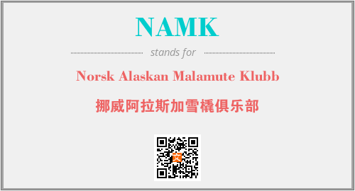 上述内容是“Norsk Alaskan Malamute Klubb”作为“NAMK”的缩写,解释为“挪威阿拉斯加雪橇俱乐部”时的信息,以及英文缩略词NAMK所代表的英文单词,其对应的中文拼音、详细解释以及在英文中的流行度和相关分类、应用领域及应用示例等。