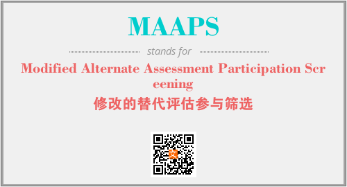 上述内容是“Modified Alternate Assessment Participation Screening”作为“MAAPS”的缩写,解释为“修改的替代评估参与筛选”时的信息,以及英文缩略词MAAPS所代表的英文单词,其对应的中文拼音、详细解释以及在英文中的流行度和相关分类、应用领域及应用示例等。