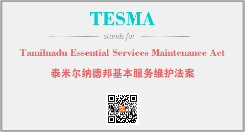 上述内容是“Tamilnadu Essential Services Maintenance Act”作为“TESMA”的缩写,解释为“泰米尔纳德邦基本服务维护法案”时的信息,以及英文缩略词TESMA所代表的英文单词,其对应的中文拼音、详细解释以及在英文中的流行度和相关分类、应用领域及应用示例等。