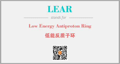 上述内容是“Low Energy Antiproton Ring”作为“LEAR”的缩写,解释为“低能反质子环”时的信息,以及英文缩略词LEAR所代表的英文单词,其对应的中文拼音、详细解释以及在英文中的流行度和相关分类、应用领域及应用示例等。