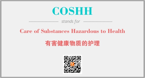 上述内容是“Care of Substances Hazardous to Health”作为“COSHH”的缩写,解释为“有害健康物质的护理”时的信息,以及英文缩略词COSHH所代表的英文单词,其对应的中文拼音、详细解释以及在英文中的流行度和相关分类、应用领域及应用示例等。