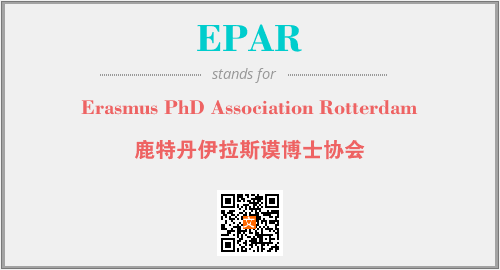 上述内容是“Erasmus PhD Association Rotterdam”作为“EPAR”的缩写,解释为“鹿特丹伊拉斯谟博士协会”时的信息,以及英文缩略词EPAR所代表的英文单词,其对应的中文拼音、详细解释以及在英文中的流行度和相关分类、应用领域及应用示例等。