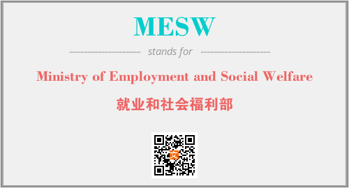 上述内容是“Ministry of Employment and Social Welfare”作为“MESW”的缩写,解释为“就业和社会福利部”时的信息,以及英文缩略词MESW所代表的英文单词,其对应的中文拼音、详细解释以及在英文中的流行度和相关分类、应用领域及应用示例等。