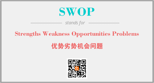英文缩略词“SWOP”经常作为“Strengths Weakness Opportunities Problems”的英文缩写来使用,中文表示:“优势劣势机会问题”。本文将详细介绍英文缩写词SWOP所代表英文单词,其对应的中文拼音、详细解释以及在英语中的流行度。此外,还有关于缩略词SWOP的分类、应用领域及相关应用示例等。