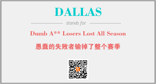 英文缩略词“DALLAS”经常作为“Dumb A** Losers Lost All Season”的英文缩写来使用,中文表示:“愚蠢的失败者输掉了整个赛季”。本文将详细介绍英文缩写词DALLAS所代表英文单词,其对应的中文拼音、详细解释以及在英语中的流行度。此外,还有关于缩略词DALLAS的分类、应用领域及相关应用示例等。