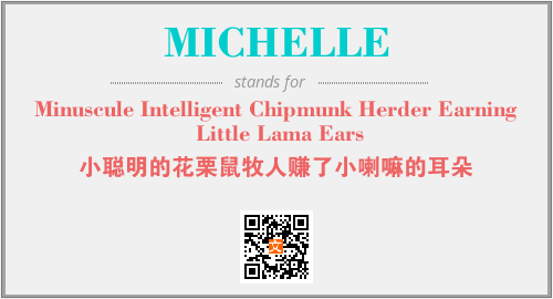 上述内容是“Minuscule Intelligent Chipmunk Herder Earning Little Lama Ears”作为“MICHELLE”的缩写,解释为“小聪明的花栗鼠牧人赚了小喇嘛的耳朵”时的信息,以及英文缩略词MICHELLE所代表的英文单词,其对应的中文拼音、详细解释以及在英文中的流行度和相关分类、应用领域及应用示例等。