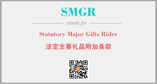 上述内容是“Statutory Major Gifts Rider”作为“SMGR”的缩写,解释为“法定主要礼品附加条款”时的信息,以及英文缩略词SMGR所代表的英文单词,其对应的中文拼音、详细解释以及在英文中的流行度和相关分类、应用领域及应用示例等。