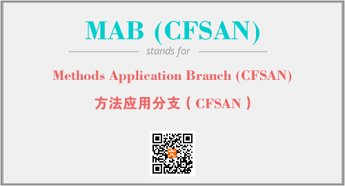 上述内容是“Methods Application Branch (CFSAN)”作为“MAB (CFSAN)”的缩写,解释为“方法应用分支(CFSAN)”时的信息,以及英文缩略词MAB (CFSAN)所代表的英文单词,其对应的中文拼音、详细解释以及在英文中的流行度和相关分类、应用领域及应用示例等。