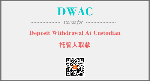 英文缩略词“DWAC”经常作为“Deposit Withdrawal At Custodian”的英文缩写来使用,中文表示:“托管人取款”。本文将详细介绍英文缩写词DWAC所代表英文单词,其对应的中文拼音、详细解释以及在英语中的流行度。此外,还有关于缩略词DWAC的分类、应用领域及相关应用示例等。