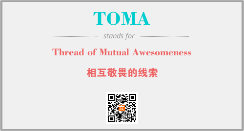 上述内容是“Thread of Mutual Awesomeness”作为“TOMA”的缩写,解释为“相互敬畏的线索”时的信息,以及英文缩略词TOMA所代表的英文单词,其对应的中文拼音、详细解释以及在英文中的流行度和相关分类、应用领域及应用示例等。