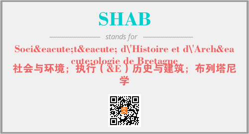 上述内容是“Société d\'Histoire et d\'Archéologie de Bretagne”作为“SHAB”的缩写,解释为“社会与环境;执行(&E)历史与建筑;布列塔尼学”时的信息,以及英文缩略词SHAB所代表的英文单词,其对应的中文拼音、详细解释以及在英文中的流行度和相关分类、应用领域及应用示例等。
