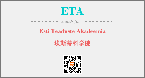 上述内容是“Esti Teaduste Akadeemia”作为“ETA”的缩写,解释为“埃斯蒂科学院”时的信息,以及英文缩略词ETA所代表的英文单词,其对应的中文拼音、详细解释以及在英文中的流行度和相关分类、应用领域及应用示例等。