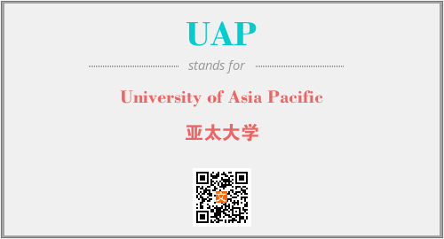 英文缩略词“UAP”经常作为“University of Asia Pacific”的英文缩写来使用,中文表示:“亚太大学”。本文将详细介绍英文缩写词UAP所代表英文单词,其对应的中文拼音、详细解释以及在英语中的流行度。此外,还有关于缩略词UAP的分类、应用领域及相关应用示例等。