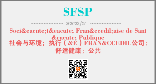 上述内容是“Société Française de Santé Publique”作为“SFSP”的缩写,解释为“社会与环境;执行(&E)FRAN&CCEDIL公司;舒适健康;公共”时的信息,以及英文缩略词SFSP所代表的英文单词,其对应的中文拼音、详细解释以及在英文中的流行度和相关分类、应用领域及应用示例等。