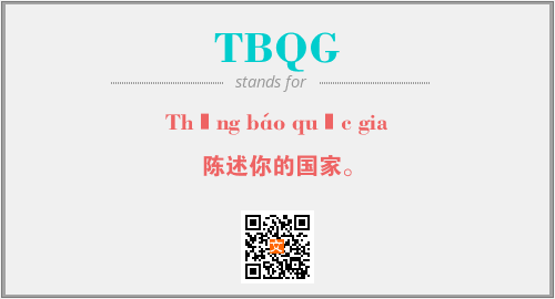 上述内容是“Thông báo quốc gia”作为“TBQG”的缩写,解释为“陈述你的国家。”时的信息,以及英文缩略词TBQG所代表的英文单词,其对应的中文拼音、详细解释以及在英文中的流行度和相关分类、应用领域及应用示例等。