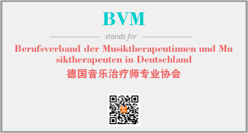 上述内容是“Berufsverband der Musiktherapeutinnen und Musiktherapeuten in Deutschland”作为“BVM”的缩写,解释为“德国音乐治疗师专业协会”时的信息,以及英文缩略词BVM所代表的英文单词,其对应的中文拼音、详细解释以及在英文中的流行度和相关分类、应用领域及应用示例等。