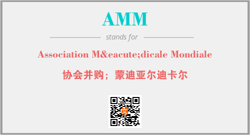 上述内容是“Association Médicale Mondiale”作为“AMM”的缩写,解释为“协会并购;蒙迪亚尔迪卡尔”时的信息,以及英文缩略词AMM所代表的英文单词,其对应的中文拼音、详细解释以及在英文中的流行度和相关分类、应用领域及应用示例等。