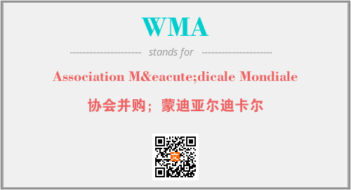 上述内容是“Association Médicale Mondiale”作为“WMA”的缩写,解释为“协会并购;蒙迪亚尔迪卡尔”时的信息,以及英文缩略词WMA所代表的英文单词,其对应的中文拼音、详细解释以及在英文中的流行度和相关分类、应用领域及应用示例等。