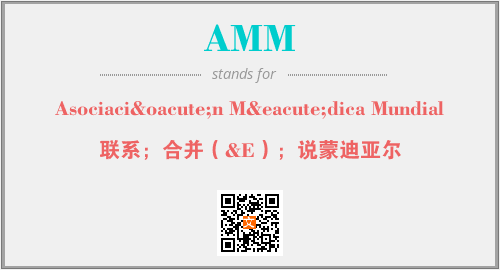 英文缩略词“AMM”经常作为“Asociación Médica Mundial”的英文缩写来使用,中文表示:“联系;合并(&E);说蒙迪亚尔”。本文将详细介绍英文缩写词AMM所代表英文单词,其对应的中文拼音、详细解释以及在英语中的流行度。此外,还有关于缩略词AMM的分类、应用领域及相关应用示例等。