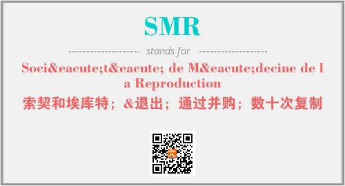 上述内容是“Société de Médecine de la Reproduction”作为“SMR”的缩写,解释为“索契和埃库特;&退出;通过并购;数十次复制”时的信息,以及英文缩略词SMR所代表的英文单词,其对应的中文拼音、详细解释以及在英文中的流行度和相关分类、应用领域及应用示例等。