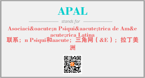 上述内容是“Asociación Psiquiátrica de América Latina”作为“APAL”的缩写,解释为“联系;n Psiqui和aacute;三角网(&E);拉丁美洲”时的信息,以及英文缩略词APAL所代表的英文单词,其对应的中文拼音、详细解释以及在英文中的流行度和相关分类、应用领域及应用示例等。