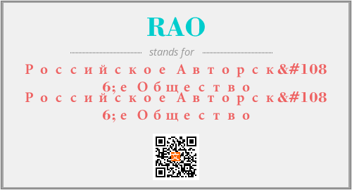 上述内容是“Российское Авторское Общество”作为“RAO”的缩写,解释为“Российское Авторское Общество”时的信息,以及英文缩略词RAO所代表的英文单词,其对应的中文拼音、详细解释以及在英文中的流行度和相关分类、应用领域及应用示例等。
