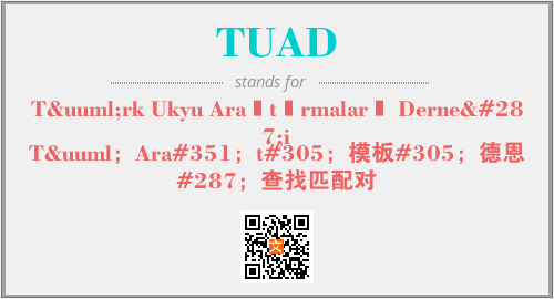 上述内容是“Türk Ukyu Araştırmaları Derneği”作为“TUAD”的缩写,解释为“Tü;Ara#351;t#305;模板#305;德恩#287;查找匹配对”时的信息,以及英文缩略词TUAD所代表的英文单词,其对应的中文拼音、详细解释以及在英文中的流行度和相关分类、应用领域及应用示例等。
