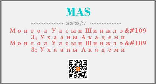上述内容是“Монгол Улсын Шинжлэх Ухааны Академи”作为“MAS”的缩写,解释为“Монгол Улсын Шинжлэх Ухааны Академи”时的信息,以及英文缩略词MAS所代表的英文单词,其对应的中文拼音、详细解释以及在英文中的流行度和相关分类、应用领域及应用示例等。