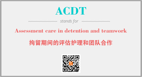 上述内容是“Assessment care in detention and teamwork”作为“ACDT”的缩写,解释为“拘留期间的评估护理和团队合作”时的信息,以及英文缩略词ACDT所代表的英文单词,其对应的中文拼音、详细解释以及在英文中的流行度和相关分类、应用领域及应用示例等。