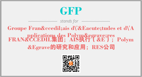 上述内容是“Groupe Français d\'Études et d\'Applications des Polymères”作为“GFP”的缩写,解释为“FRAN&CCEDIL集团;AIS执行(&E);PolymÈ的研究和应用;RES公司”时的信息,以及英文缩略词GFP所代表的英文单词,其对应的中文拼音、详细解释以及在英文中的流行度和相关分类、应用领域及应用示例等。
