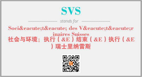 上述内容是“Société des Vétérinaires Suisses”作为“SVS”的缩写,解释为“社会与环境;执行(&E)结束(&E)执行(&E)瑞士里纳雷斯”时的信息,以及英文缩略词SVS所代表的英文单词,其对应的中文拼音、详细解释以及在英文中的流行度和相关分类、应用领域及应用示例等。