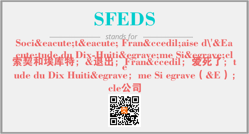 英文缩略词“SFEDS”经常作为“Société Française d\'Étude du Dix-Huitième Siècle”的英文缩写来使用,中文表示:“索契和埃库特;&退出;Franç;爱死了;tude du Dix Huitiè;me Si egrave(&E);cle公司”。本文将详细介绍英文缩写词SFEDS所代表英文单词,其对应的中文拼音、详细解释以及在英语中的流行度。此外,还有关于缩略词SFEDS的分类、应用领域及相关应用示例等。