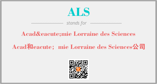 英文缩略词“ALS”经常作为“Académie Lorraine des Sciences”的英文缩写来使用,中文表示:“Acad和eacute;mie Lorraine des Sciences公司”。本文将详细介绍英文缩写词ALS所代表英文单词,其对应的中文拼音、详细解释以及在英语中的流行度。此外,还有关于缩略词ALS的分类、应用领域及相关应用示例等。
