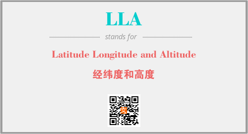 上述内容是“Latitude Longitude and Altitude”作为“LLA”的缩写,解释为“经纬度和高度”时的信息,以及英文缩略词LLA所代表的英文单词,其对应的中文拼音、详细解释以及在英文中的流行度和相关分类、应用领域及应用示例等。
