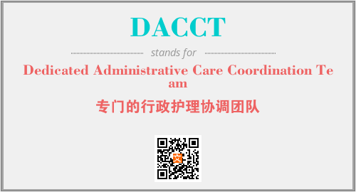 英文缩略词“DACCT”经常作为“Dedicated Administrative Care Coordination Team”的英文缩写来使用,中文表示:“专门的行政护理协调团队”。本文将详细介绍英文缩写词DACCT所代表英文单词,其对应的中文拼音、详细解释以及在英语中的流行度。此外,还有关于缩略词DACCT的分类、应用领域及相关应用示例等。